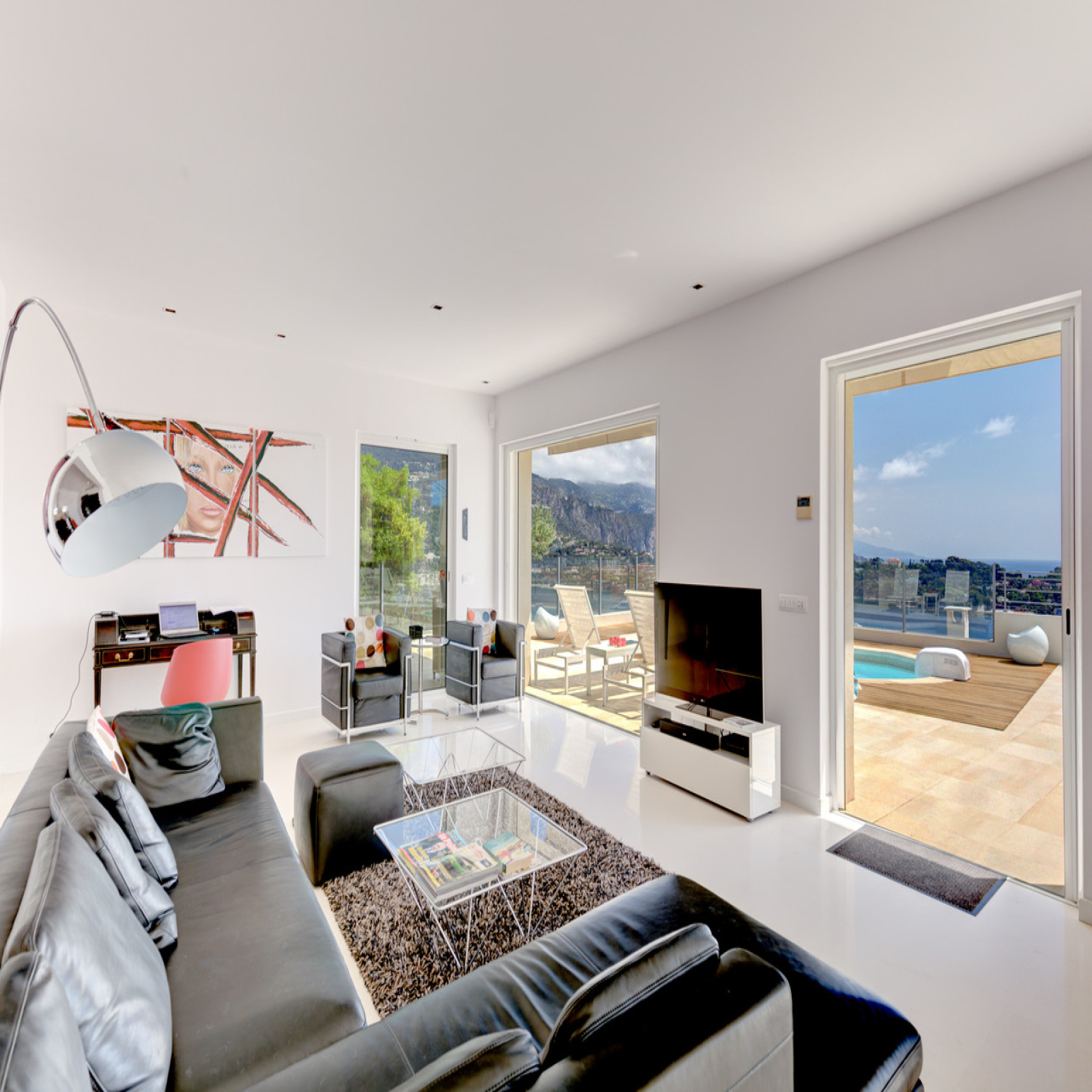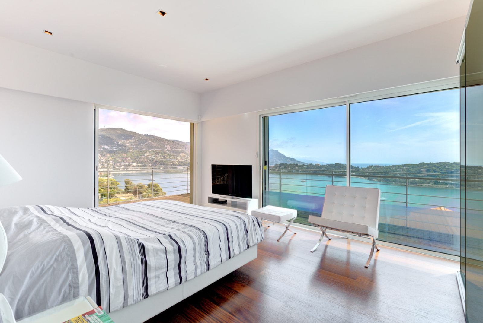 • Deze moderne villa heeft een uitzonderlijke ligging, direct tegenover het bos van het Nationaal Park, met uitzicht op de baai van Villefranche-sur-Mer richting Saint-Jean-Cap-Ferrat en biedt een adembenemend panorama op het bos, de zee en het schiereiland.