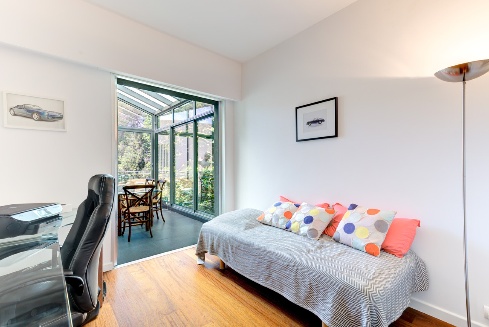 Boven zijn er drie slaapkamers met badkamer of douche, waaronder de hoofdslaapkamer. Daarnaast is er een vierde slaapkamer of kantoor met een veranda met uitzicht op het bos.