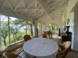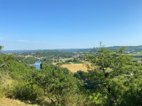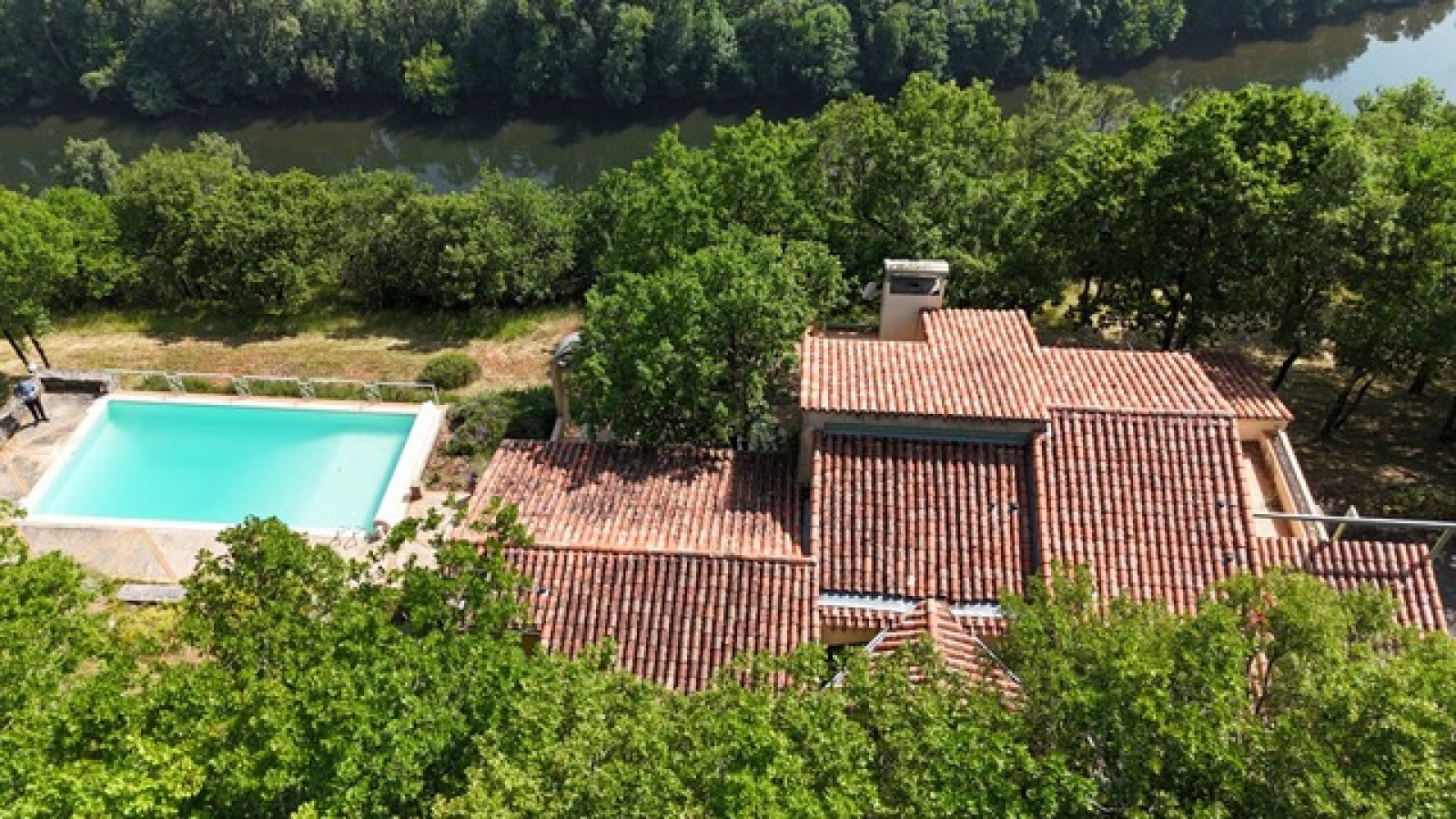Woonkamer van 38,5 m2 met open haard + insert, stenen vloer, erker met toegang tot het terras en het zwembad met uitzicht.