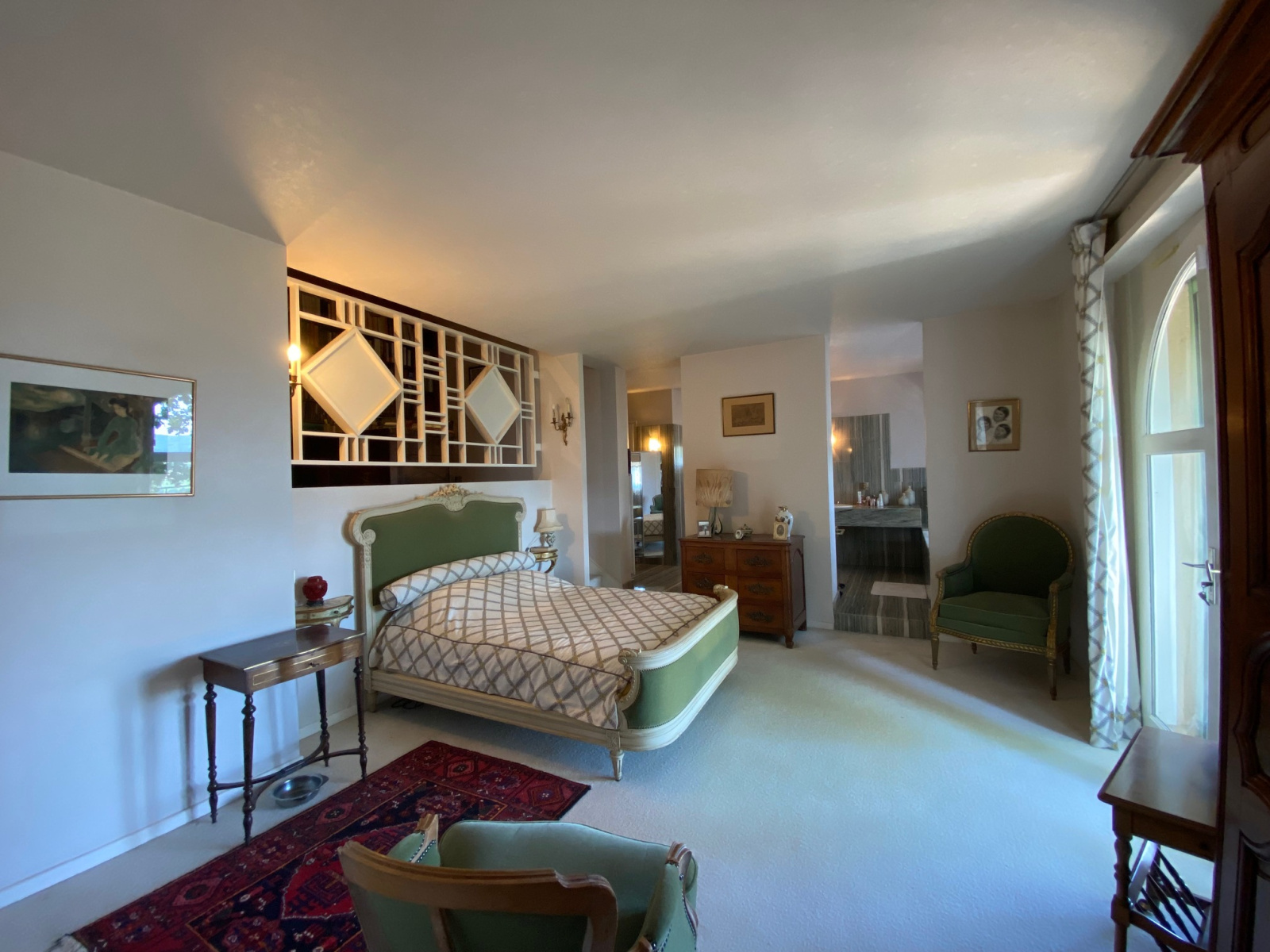 Een slaapkamer van 24 m2, inbouwkasten, erker met toegang tot het terras en het zwembad met een eigen badkamer van 12,5 m2, voorzien van bad, inloopdouche, wastafel, bidet, apart toilet, inbouwkast en marmeren vloer.