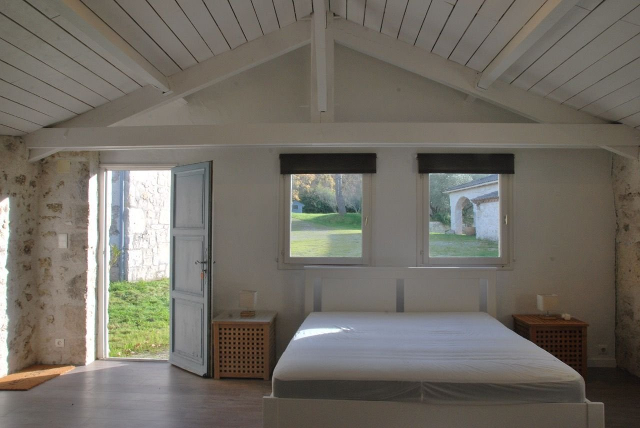 In een bijgebouw, een slaapkamer met doucheruimte.