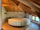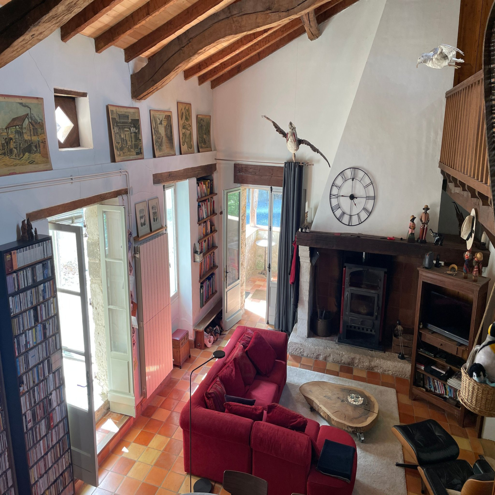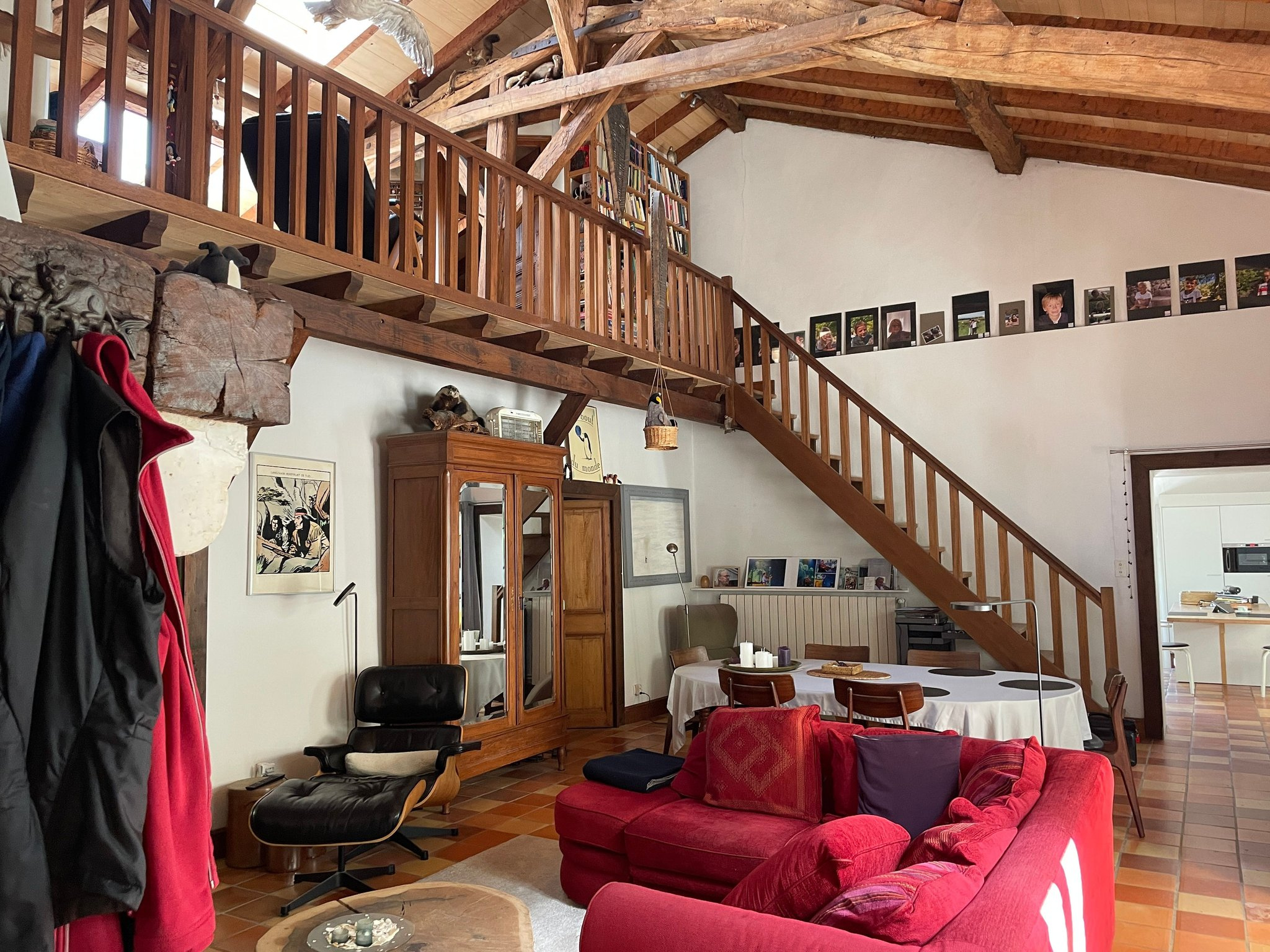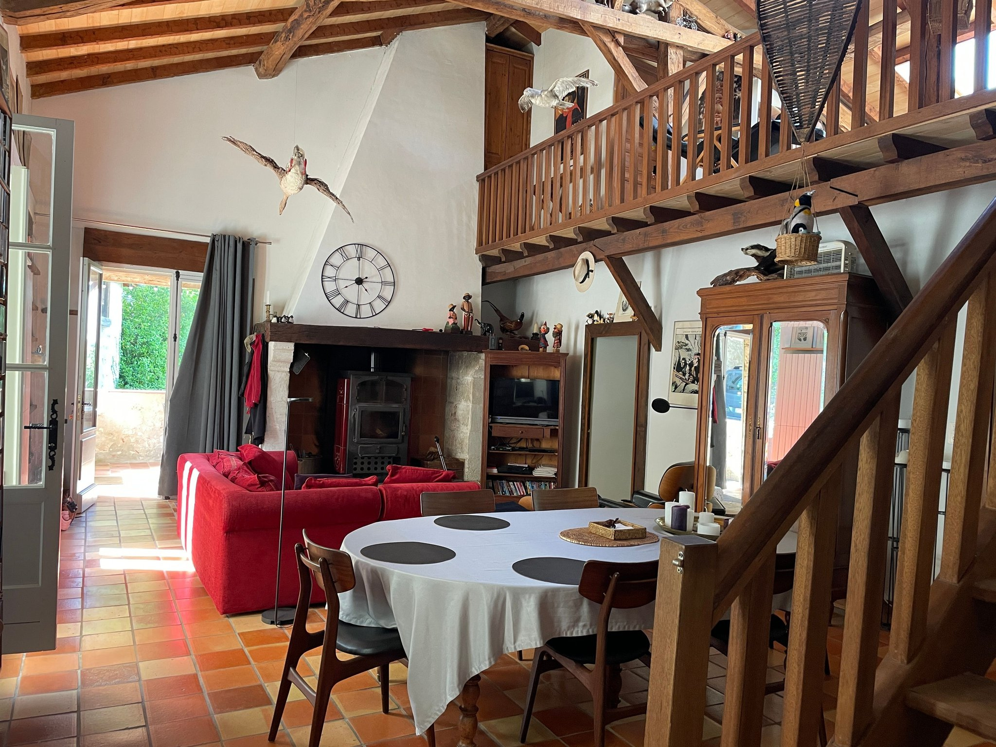 De hal heeft een overdekt terras, vanwaar u toegang heeft tot de open woonkamer met open haard, houtkachel en terracotta tegels. Vanuit de woonkamer heeft u toegang tot een mezzanine met twee kleine slaapkamers.