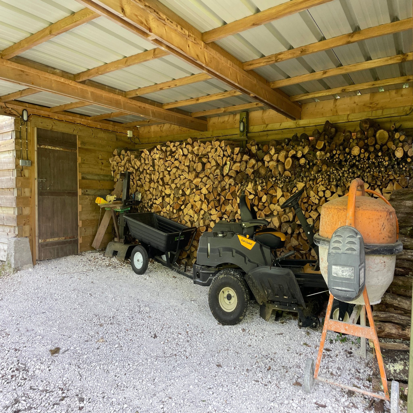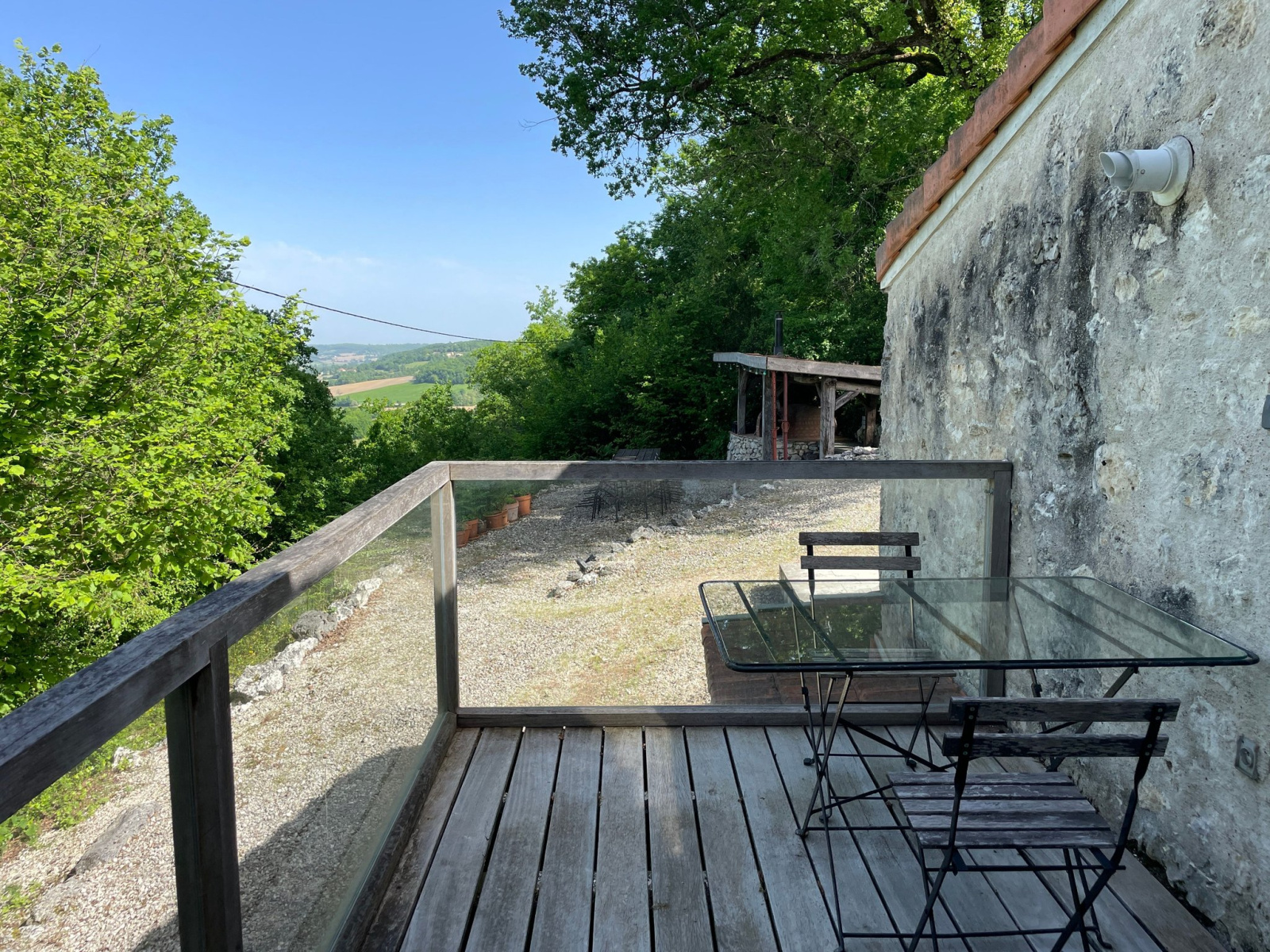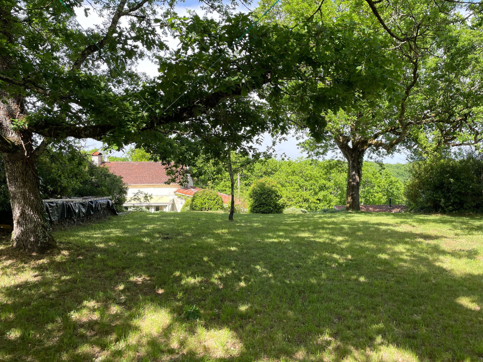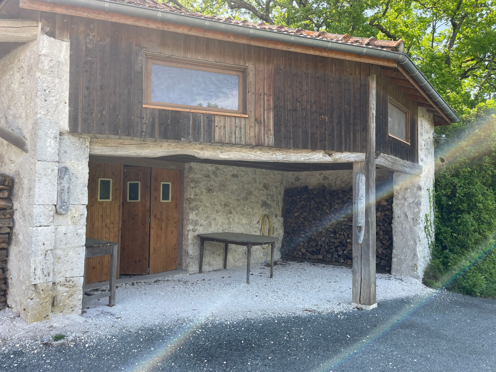 In de schuur bevindt zich een omgebouwde ruimte op de bovenverdieping met een doucheruimte en een garage op de begane grond. Verderop in de tuin staat een carport van 50 m². Een natuurlijke tuin met eeuwenoude eiken, enkele wilde truffeleiken en een prachtig uitzicht.