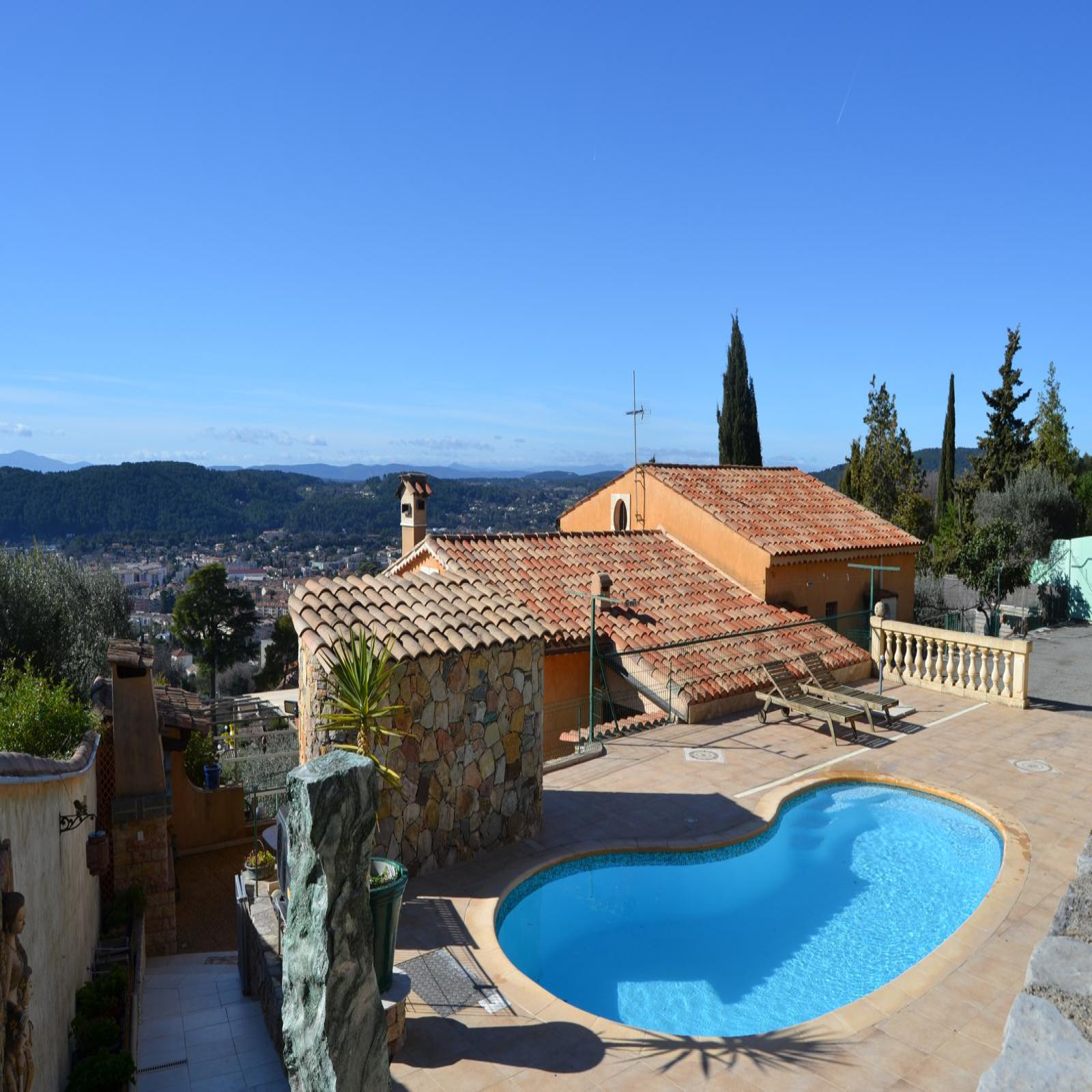 Deze traditionele villa, gelegen op een heuvel met uitzicht over Draguignan, de hoofdstad van de Groene Provence, heeft een ligging op het zuiden en biedt een panoramisch uitzicht over de stad. De villa bevindt zich in een rustige woonwijk en biedt circa 185 m² woonruimte op een omheind perceel van 1.050 m², voorzien van een intercom en een automatische poort.